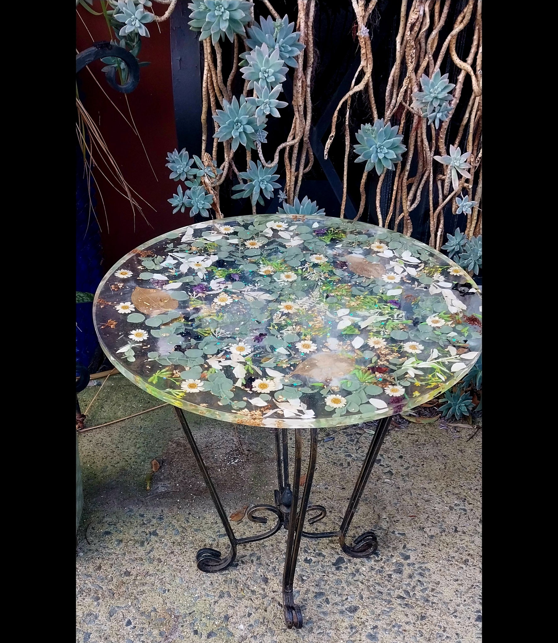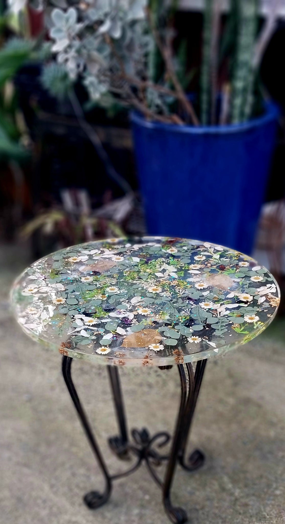 Original Art piece - coffee table with daisy floral design encased in resin, with 24k gold leaf accents, all atop an ornate base. The combination of natural floral beauty and luxurious gold leaf creates a striking, one-of-a-kind piece.